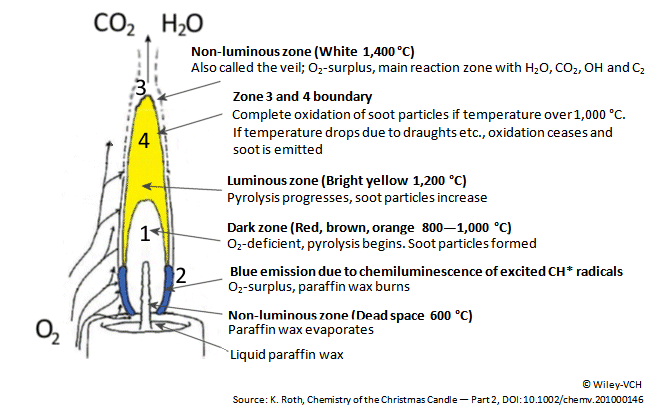 이렇게 쪼개진 수많은 탄화수소 물질들은 한껏 달구어져 대류에 의해 심지 위쪽으로 솟구쳐 올라가게 된다. 이 때 산소는 촛불 주변으로부터 확산되어 들어와 발화점 이상의 이 물질들과 결합하게 된다. 때문에 가장 바깥쪽에 있는 기체 파라핀들이 산소와 가장 효과적으로 만나게 되고 여기서는 완전 연소에 가까운 화학 반응이 일어나게 된다. 물론 반응하지 않은 산소들은 계속 안쪽으로 확산해 들어가게 될 것이지만 아무래도 그 양은 현저히 줄어들 수 밖에 없다. 많은 양의 산소들과 만나게 될 것이라고 기대한 안쪽에 있던 탄화수소들은 실망할 수 밖에 없다. 그나마 부족한 산소들과 결합을 하게 되지만 이것은 결국 불완전 연소로 귀결되고, 그 결과 일산화탄소와 탄소 입자들이 생산된다. 탄소 입자가 생겨나고 보니 온도가 1,000 ℃ 정도 되는 뜨거운 상황이다. 때문에 탄소 입자는 한껏 달구어지게 되고, 여기서 노란색과 붉은색의 전자기파가 대량으로 방출되는 것이다. 단지 탄소가 작은 사이즈의 미세한 입자라는 것만 차이가 있을 뿐 빛을 내는 원리는 탄소 필라멘트 전구와 다를 바 없는 것이다.