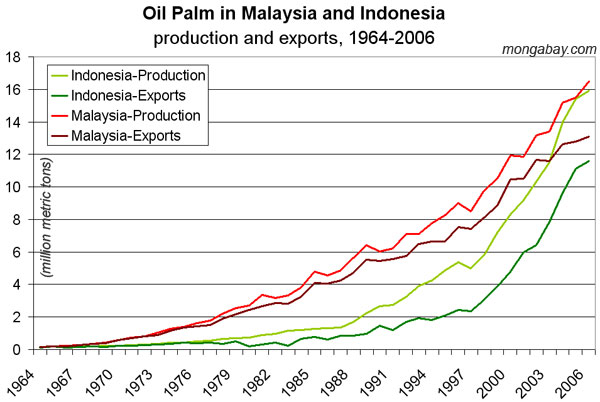 이러한 팜유의 생산이 크기 늘어난 것이 1950년대 이후인데, 기름야자나무가 잘 자랄만한 천혜의 조건을 갖춘 지역에서 빽빽하게 조성된 야자나무 플랜테이션이 그야말로 우후죽순처럼 들어서기 시작했다. 팜유의 생산량은 덩달아 급증하기 시작했는데 2006년에는 콩기름을 밀어내고 전세계 식물성 기름 생산량 1위를 차지하는 위업을 달성하였다.