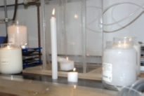 자, 그렇다면 이제 원료가 되는 이 파라핀과 콩기름으로부터 양초를 만들어 보자. 먼저 파라핀 양초를 만들어 보는 시간이다: 종이컵을 준비하고 안쪽에 비눗물을 발라준다. 컵 위에 심지를 돌려 얹은 나무젓가락을 올려놓고 심지를 드리운다. 가열시켜 녹인 파라핀을 컵에 붓는다. 하루 종일 식힌다. 그리고 굳은 양초를 컵에서 빼낸다. 간단하지?