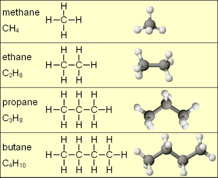 탄소와 수소의 결합으로만 구성된 탄화수소(hydrocarbon)류 중에서 모든 탄소간 결합이 단일 결합인 경우 우리는 그것을 알케인(alkane)이라고 부른다. 화학식으로는 CnH2n+2 으로 표기되는데 탄소 수(n)와 결합 방식에 따라 불리는 이름이 천차만별이다. 가장 간단한 것은 탄소가 하나(n=1)인 것으로 그 이름은 LNG의 주원료인 메테인(methane, 속칭 메탄)이다. LPG 가스의 주원료인 프로페인(propane, 속칭 프로판)은 탄소 수가 셋(n=3)인 알케인이며 휴대용 버너에 쓰는 가스통의 원료인 뷰테인(butane, 속칭 부탄)은 탄소 수가 하나 더 많은 넷(n=4)이다.