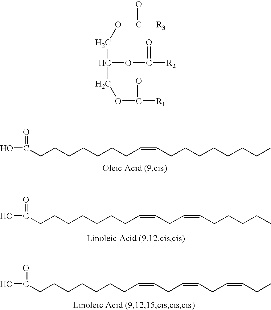 하지만 식물성 기름은 석유에서 얻은 파라핀과는 화학구조가 완전히 다르게 생겼기 때문에 그러한 화학 지식을 직접적으로 적용할 수 없다. 대체 어떻게 생겼기에? 알케인인 파라핀과는 달리, 식물성 기름은 트라이글라이세라이드(triglyceride)라고 불리는 물질로 구성되어 있다. 이 분자에 대해 화학적으로 조금만 이야기를 더 하자면, 세 개의 지방산(fatty acid)과 글라이세롤(glycerol)이 결합된 에스터(ester)화합물이다. 결국 식물성 기름의 종류를 판별짓는 것은 바로 글라이세롤에 연결된 지방산 세 개의 종류가 어떤 것이냐에 달렸다.