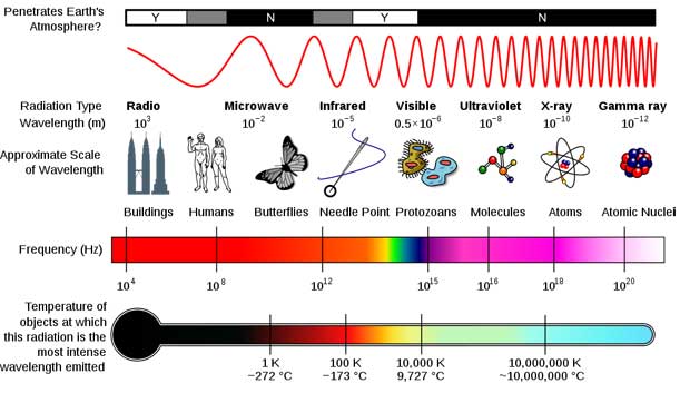 그렇다면 태양보다 온도가 더 낮은 물체들은 어떠한가? 아주 뜨겁게 가열한 철사는 노란 빛을 띠지만 조금 식히면 붉게 변한다. 즉, 온도가 낮아지니 방출되는 전자기파의 파장이 길어진 것이다. 극단적으로 온도를 낮춰보자. 예를 들어 우리 인체의 경우 체온이 36.5도 이므로 피부의 온도는 이보다 약간 낮은 수준일 것이다. 온도가 이처럼 낮기 때문에 아쉽게도 우리 몸은 천사들과 올림포스의 신들처럼 찬란한 가시광선을 발하는 빛난 형체를 가질 수는 없다. 하지만 그보다 긴 파장의 적외선은 발생시키기에 충분하다. 어두운 밤에 사람을 발견하고 감시하기 위해 적외선 탐지기를 쓰는 이유가 바로 여기에 있다.