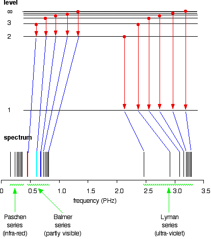 전자의 에너지 전이에 의해 발생하는 빛의 범위는 자외선부터 원적외선까지 다양한데, 특히 가장 기본이 되는 원자 번호 1번의 수소의 선 스펙트럼은 상당히 면밀히 연구되어서 에너지 전이에 의한 빛의 파장이 모두 계산되었고 실제 실험 결과와 상당히 일치함을 확인하였다. 자외선 영역에서는 121.6 nm, 102.5 nm, 97.2 nm … 등의 빛들이 관찰되는데 이들을 발견자의 이름을 따서 라이먼 계열(Lyman Series)이라고 부른다. 또한 가시광선 영역에서는 656.3 nm, 486.1 nm, 434.1 nm… 등의 빛들이 관찰되었고 역시 관찰자의 이름을 따서 발머 계열(Balmer Series)이라고 부른다. 마찬가지로 근적외선과 원적외선 영역에서도 빛이 관찰되었는데 이를 각각 파셴 계열(Paschen Series), 브래킷 계열(Bracket Series)이라고 부른다. 하지만 적외선 이후부터는 빛의 세기는 매우 작아지며 마이크로파 이후에서는 관찰이 매우 어려워진다. 따라서 전자의 에너지 준위 차이에서 비롯된 전자기파의 흡수 및 방출은 주로 자외선과 가시광선, 근적외선의 영향이 더 크며 원적외선이 여기에 낄 자리는 아닌 것 같다. 적외선은 이보다 더 낮은 에너지를 다뤄야 한다.