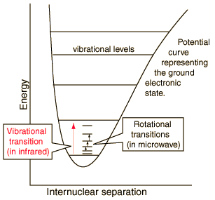 바로 이 미소한 에너지 차이와 관련된 것이 분자의 회전(rotation)이다. 분자의 회전 상태가 변하게 될때 원적외선~마이크로파가 흡수, 방출되는데 이것을 가장 잘 활용한 예가 주방에 있는 전자레인지이다. 전자레인지에서 발생하는 마이크로파는 내부의 음식물에 함유된 물 분자를 활발하게 진동시킨다. 이 진동하는 물이 주변 분자들과 심히 마찰하면서 열을 발생시키게 되고 이를 통해 음식을 데우게 된다. 즉, 적절한 진동수의 원적외선을 쬐어주면 어떤 분자는 이를 흡수하여 자신의 진동 상태를 바꾸는 데 사용한다는 것이다.