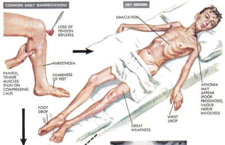 비타민의 등장을 배울 때 항상 빠지지 않고 등장하는 것이 바로 각기병(脚氣病, beriberi)이다. 옥스포드 영어 사전에 의하면 스리랑카의 언어인 싱할라어로 '약하다' 혹은 '할 수 없다'라는 말을 첩어(疊語)로 만든 단어가 이 증상의 명칭이 되었다고 한다. 도정된 백미(白米)를 주식으로 삼던 동아시아에서 많이 발병했던 병이라고 하는데, 19세기가 될 때까지 이 깔끔하게 도정된 고급진 쌀이 문제가 되리라고는 미처 생각하지 못했다고 한다. 처음 이에 대해 연구한 사람은 일본 제국 해군이자 최종직급이 군의총감(軍醫總監)에 이르렀던 의학박사 다카기 가네히로(高木兼寛)였다고 한다. 몇 개월이나 바다에서 장거리 운항을 해야 하는 일본 해군이 앓고 있던 골치 아픈 문제는 바로 각기병으로 인한 군인들의 사망이었는데, 다카기 가네히로는 병사들, 특히 부식비는 따로 빼돌린 채 백미만 먹어 허기만 달래는 하급 병사들의 식단에 각기병을 불러들이는 문제가 있음을 알아차렸다. 그래서 그는 전함 한 척에는 늘 그래왔듯 백미 위주의 식단을 제공하는 한편, 다른 한 척에는 서양의 방식을 따라 고기와 생선, 잡곡 등으로 구성된 식단을 제공하는 실험을 진행했는데, 전함에 탑승한 병사들 사이의 각기병 유병률과 사망률에 현격한 차이가 있음을 확인했다. 따라서 음식에 있는 무언가가 영향을 주는 것이 확실했는데, 당시 다카기 박사와 일본 해군은 고기를 비롯한 서양 음식의 단백질에 병을 예방하는 성분이 있는 것이라고 생각했다.