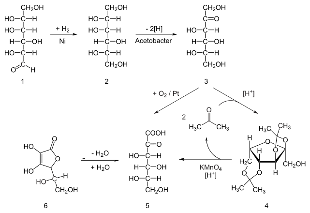 미생물 공업에 화학적 합성법을 가미하는 경우도 있다. 비타민 C라고 불리는 아스코르브산(ascorbic acid)의 경우 타데우스 라이히슈타인(Tadeusz Reichstein)이라는 폴란드 태생의 스위스 화학자와 취리히 연방 공대(Eidgenössische Technische Hochschule Zürich)의 동료 연구자들에 의해 포도당으로부터 비타민 C를 합성하는 방법이 이미 1933년에 개발된 바 있다. 먼저 녹말을 효소로 분해하여 포도당을 얻는다. 여기서 1편 소이 캔들 이야기에서 잠깐 언급된 바 있는 화학 과정이 추가되는데 바로 니켈 금속 촉매 하에서 수소화(hydrogenation)를 진행하는 것이다. 포도당에 존재하는 알데하이드(aldehyde)기가 환원되면 알코올의 수산화(hydroxide)기가 되는 것은 고등학생들도 아는 기본적인 화학 지식이다. 수소화 된 포도당은 솔비톨(sorbitol)이 되며 이제 여기에 초산균(acetobacter)을 투입하여 발효를 진행시키면 솔보즈(sorbose)가 된다. 솔보즈의 수산화기는 과망간산 포타슘(KMnO4) 하에서 산화되어 카복실(carboxyl) 기가 되는데, 솔보즈는 총 다섯 개의 수산화기를 가지고 있기 떄문에 만일 그냥 산화 과정을 진행시키면 모든 수산화기가 제각각 산화 반응을 진행하게 되므로 원하는 케토굴론산(ketogulonic acid)이 아닌 온갖 잡다한 생성물이 등장하게 된다. 다행히도 산화시켜야 하는 하나의 수산화기를 제외한 나머지 네 개의 수산화기는 인접한 탄소 원자에 결합된 수산화기이므로 두 개의 1,2-다이올로 취급할 수 있으며, 아세톤을 도입하면 이들이 효과적으로 1,2-다이올과 결합하여 아세탈(acetal)을 만들어 비활성화 시켜버린다. 따라서 산화 반응을 유도하기 전 이들 네 개의 수산화기를 아세톤을 써서두 개의 아세탈로 묶어 보호시켜 버리면 원하는 하나의 수산화기만 산화 반응을 보낼 수 있는 것이다. 그렇게 솔보즈를 카복실산으로 변환시킨 뒤 산을 가하면 아세탈은 다시 풀리게 되어 케토굴론산이 되고, 다이올을 보호하는 데 사용되었던 기체 아세톤은 반응 용기에서 쉽게 이탈되어 제거 가능해진다. 이제 최종적으로 케토굴론산에 탈수 과정을 적용시키면 물 분자가 빠져나가면서 산소 원자를 포함하는 오각형의 이종고리화합물(heterocyclic compound)이 만들어지는데, 이것이 바로 아스코르브산이다!