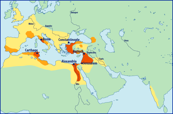 로마의 황제 콘스탄티노스 1세(Κωνσταντίνος Α΄)가 기독교 신앙의 자유를 골자로 한 밀라노 칙령(Edictum Mediolanense)을 반포한 313년에야 기독교는 황제와 기득권층으로부터 받았던 무수한 박해를 딛고 세상 밖으로 나올 수 있었다. 하지만 기독교는 질고의 시간 속에서도 전부터 로마 제국의 정치, 경제, 문화 대도시를 거점으로 하여 바닥에서부터 성장하고 있었다. 이들 도시는 초기 기독교에 입교했던 유다인들의 주 활동지였던 동시에 이방인 선교 중심지였다. 대표적인 거점 도시 셋은 다음과 같았다.