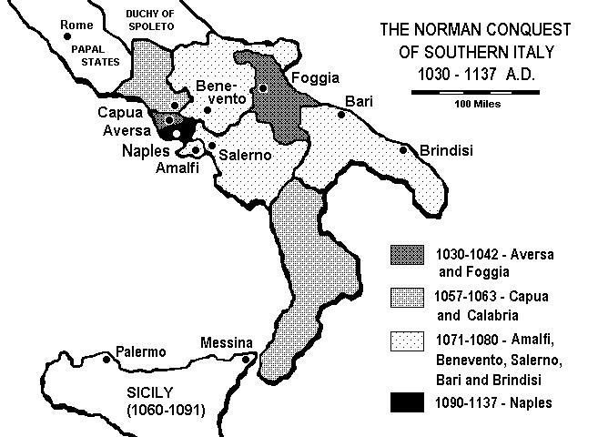 그러나 문제는 외부에서 불거지게 된다. 시칠리아 섬의 주인이 베르베르인에서 노르만(Norman)인으로 바뀌는 상황이었다. 노르만인들은 11세기부터 점차 이탈리아 남부와 시칠리아에서 영향을 미치기 시작했고 1047년에 노르만인의 수장인 드로고(Drogo)가 신성 로마 제국의 하인리히 3세로부터 정식으로 '이탈리아 공작 및 아풀리아(Apulia)와 칼라브리아(Calabria)의 백작'의 작위를 받기에 이른다. 확대되는 노르만인의 영향력에 이 지역 원주민인 이탈리아인들의 적개심은 커져갔으며 심지어 로마를 방문하는 노르만 순례자들마저 집단 린치를 당할 정도였다. 교황령의 통치자이기도 한 교황 레오 9세 역시 커져가는 노르만인들의 세력을 저지할 방도를 찾고 있었다.