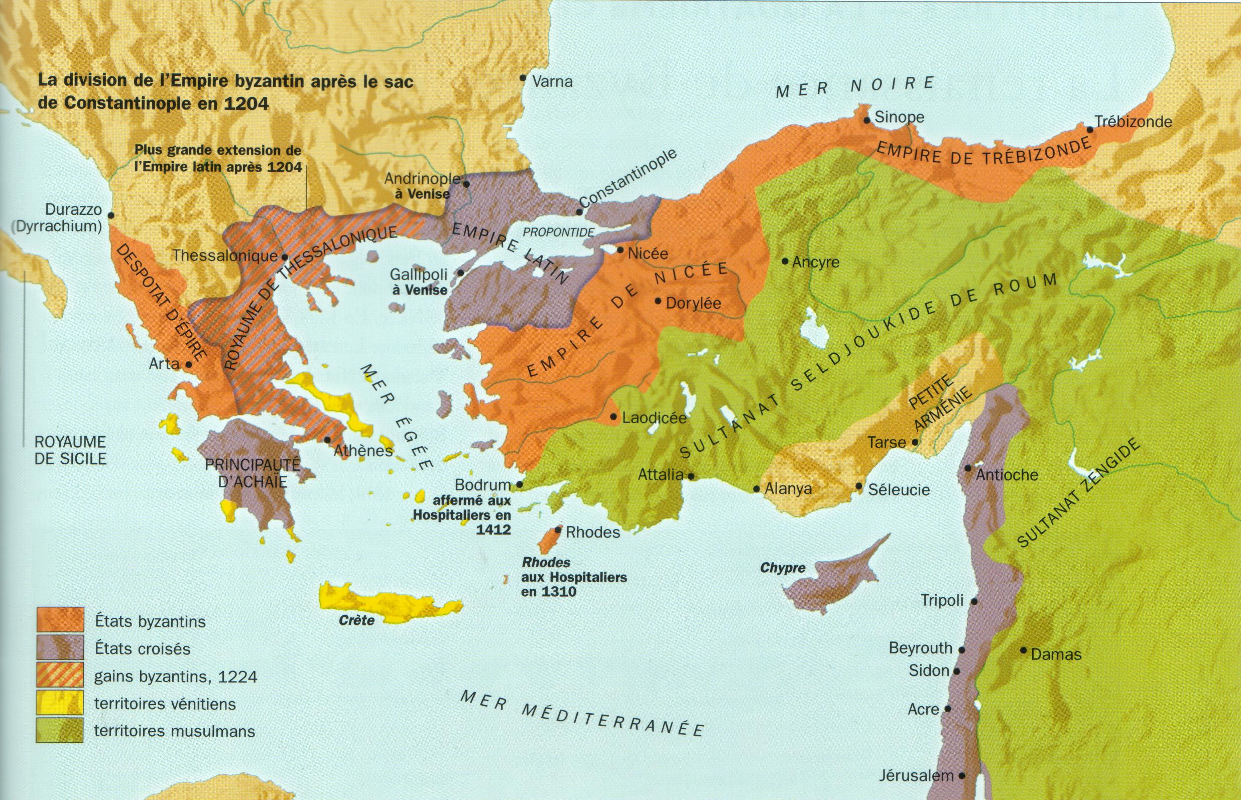 한편 십자군은 비잔티움 제국의 영토를 점령하여 라틴 제국(Imperium Romaniae)을 세웠고 초대 황제로 플랑드르(Flandre)와 에노(Hainaut)의 백작인 보두앵(Baudouin)을 옹립하였다. 원래 그 자리는 제4차 십자군의 수장이었던 보니파치오의 것이어야 했지만 베네치아인들이 자신들의 이익을 옹호하기 위해 친베네치아 성향을 가진 보두앵을 밀고 보니파치오를 경계했던 것이다. 이에 분개한 보니파치오는 테살로니키로 넘어가 테살로니키 왕국을 세웠고 초대 왕으로 등극했다.