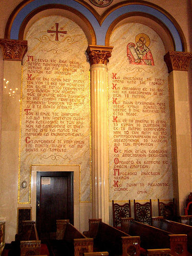Πιστεύομεν εἰς ἕνα θεὸν Πατέρα παντοκράτορα, ποιητὴν οὐρανοῦ καὶ γῆς, ὁρατῶν τε πάντων καὶ ἀοράτων.