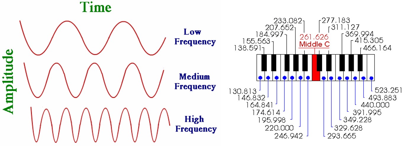 우선 음높이(pitch)를 생각해보자. 음높이란 사람이 인식하는 음파의 진동수로 정의가 된다. 즉 초당 파동이 몇 번 진동하는가에 따라 도레미파솔라시도가 결정된다고 이해하면 좋다. 단위는 헤르츠(Hz)인데 음높이의 기준이 되는 가(A)음의 진동수는 국제적으로 정의되길 440.00 Hz이다. 이보다 진동수가 높아지면 음높이는 올라가고, 진동수가 낮아지면 음높이는 내려가게 된다.