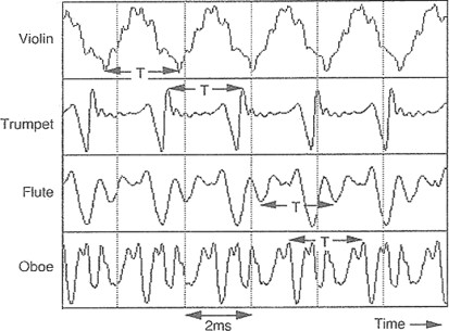그런데 음높이가 같더라도 사람은 모든 악기 소리를 동일하게 인식하지 않는다. 즉 피아노의 A음과 바이올린의 A음은 음높이는 같으나 전혀 동일하지 않은 소리이다. 이것을 음색 혹은 맵시(timbre)라고 부르는데 파동의 경우 기본 진동수는 같더라도 파형(波形, waveform)이 달라 나타나는 현상이다. 이를 이해하기 위해서는 위에서 언급한 파동의 간섭을 떠올려야 한다. 서로 다른 파동들이 합쳐지면 다른 파장을 가지는 파동을 만들 수 있는데, 이를 달리 말하면 어떤 파동은 서로 다른 기본 사인 파동들의 합으로 나타낼 수 있다는 말이다. 수학적으로 유식하게 말하면 세상 모든 파동은 서로 다른 진동수를 가지는 무수한 사인 파동들의 선형 조합으로 나타낼 수 있고,3 이는 푸리에 변환(Fourier transformation)을 통해 해석 가능하다.