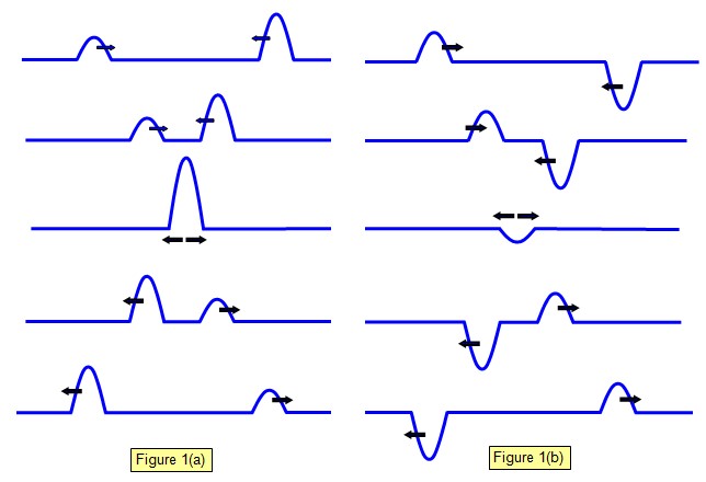 이러한 파동은 여러 가지 재미있는 성질이 있는데 대표적인 것은 중첩(重疊, superposition)과 관련되어 있다. 선형 조합(linear combination)이라는 어려운 용어를 사용하지 않고서라도 이 중첩의 원리는 간단히 설명할 수 있는데,, 각기 진행하던 파동들이 서로 만나게 되면 겹쳐지는 지역에서 파동은 위상이 단순히 더해질 뿐 각 파동의 고유한 속성이 변하지 않는다는 것이다. 아래 그림에서처럼 서로 마주오던 파동은 서로 만났다고 해서 부서지거나 합체하는 것이 아니며 만남의 시간이 끝나면 서로 쿨하게 헤어지게 된다. 그런데 이렇게 헤어질 때 자기 자신의 속성이 변하지는 않으므로 처음에 왔던 그 모습 그대로 떠나가게 된다. (왠지 각박한 현대 사회의 이별을 보는 것 같지 왜...)
