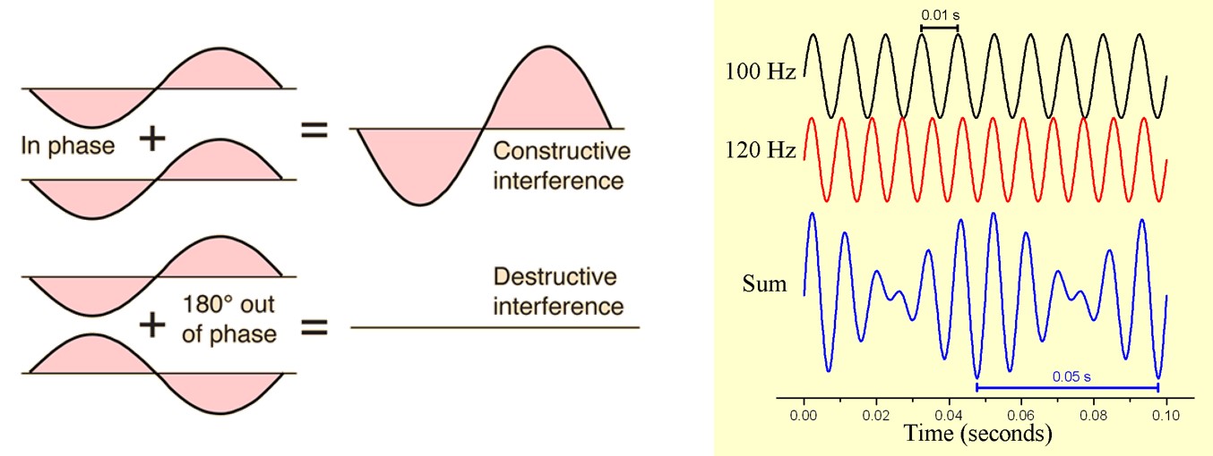 위에서는 진행이 매우 짧은 일종의 펄스(pulse)파의 중첩을 나타낸 것이었다. 그렇다면 연속적으로 이어지는 파동이 겹치면 어떻게 되나? 이 경우 우리는 새로운 파동을 얻게 되며 이를 간섭(干涉, interference)이라고 한다. 그런데 왼쪽 그림에서처럼 서로 같은 위상의 파동이 만나게 되면 진폭은 커지게 되는데 이와 같은 간섭 형태를 보강 간섭(補强干涉, constructive interference)이라고 한다. 반대로 오른쪽 그림에서처럼 서로 다른 위상의 파동이 만나게 되면 진폭은 작아지게 되는데 이를 상쇄 간섭(相殺干涉, destructive interference)이라고 한다. 극단적으로 말하면 이런 현상이 발생한다. 즉, 진폭과 진동수가 똑같은 두 파동이 간섭을 일으키면 진폭이 두 배가 된 파동이 형성된다. 그러나 동일한 파동이되 위상이 반대이면 간섭의 결과 완전히 파동이 없어진 것처럼 느껴진다. 후자의 경우 가수들의 라이브 실력을 알아보기 위해 사람들이 흔히 행하는 MR 제거의 원리인데, 즉 반주 음원의 위상을 죄다 180도 바꾸어놓고나서 가수의 라이브 음원과 중첩을 시킨다. 그러면 상쇄 간섭이 일어나서 라이브 음원에서 반주에 해당하는 소리의 파동은 죄다 없어진 것처럼 되어 버리고, 이러한 중첩과 무관한 가수의 목소리만 살아남은 결과 가수는 대중들에게 찬탄을 혹은 비난을 받게 되는 것이다.