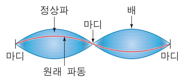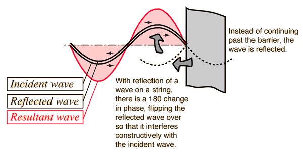그런데 위에서 언급한 파동들은 모두 끝이 없이 진행하는 파동들이다. 즉, 한번 형성된 파동은 (에너지의 감쇄가 없다고 가정할 때) 지구 끝, 아니 우주 끝까지 전달된다고 가정하는 것이다. 하지만 세상에 이런 파동들만 있는 것은 아니다. 만일 파동에게 처음과 끝이 주어지게 된다면 어떤 일이 발생할까? 예를 들어 출렁이는 밧줄이 있다고 할 때 그 밧줄의 양끝을 막대기에 묶어버린다고 해보자. 이처럼 양쪽 끝이 고정 혹은 한정된 매질에서의 파동인 경우, 고정된 점에서 파동이 반사하게 된다. 그런데 연속적인 파동이라면 이렇게 반사하여 되돌아가는 파동은 지속적으로 밀려 들어오는 파동과 중첩되어 간섭을 일으키게 된다. 그 결과 마치 전파되지 않고 가만히 멈춰 서 있는 것 같은 파동이 형성된다.1