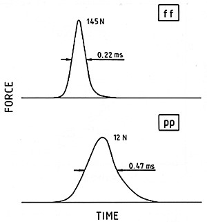 이 논리를 피아노 해머에 적용하면? 해머가 피아노 현을 세게 때리면 해머의 강도가 단단한 것과 마찬가지이므로 해머가 현에 가하는 충격시간은 짧아지게 된다. 반대로 피아노 현을 약하게 때리면 해머의 강도는 약한 것과 마찬가지이므로 해머가 현에 가하는 충격시간이 길어지게 된다. 아래 그림을 참고하면 '매우 세게'라는 셈여림표에 따라 145 N 의 힘으로 타건하면 해머가 현에 미치는 충격 시간은 0.22 ms 정도이다. 그런데 '매우 여리게'라는 셈여림표에 따라 거의 1/12 수준인 12 N 의 힘으로 타건하면 충격 시간은 0.47 ms 정도로 두 배 이상 늘어나게 된다.