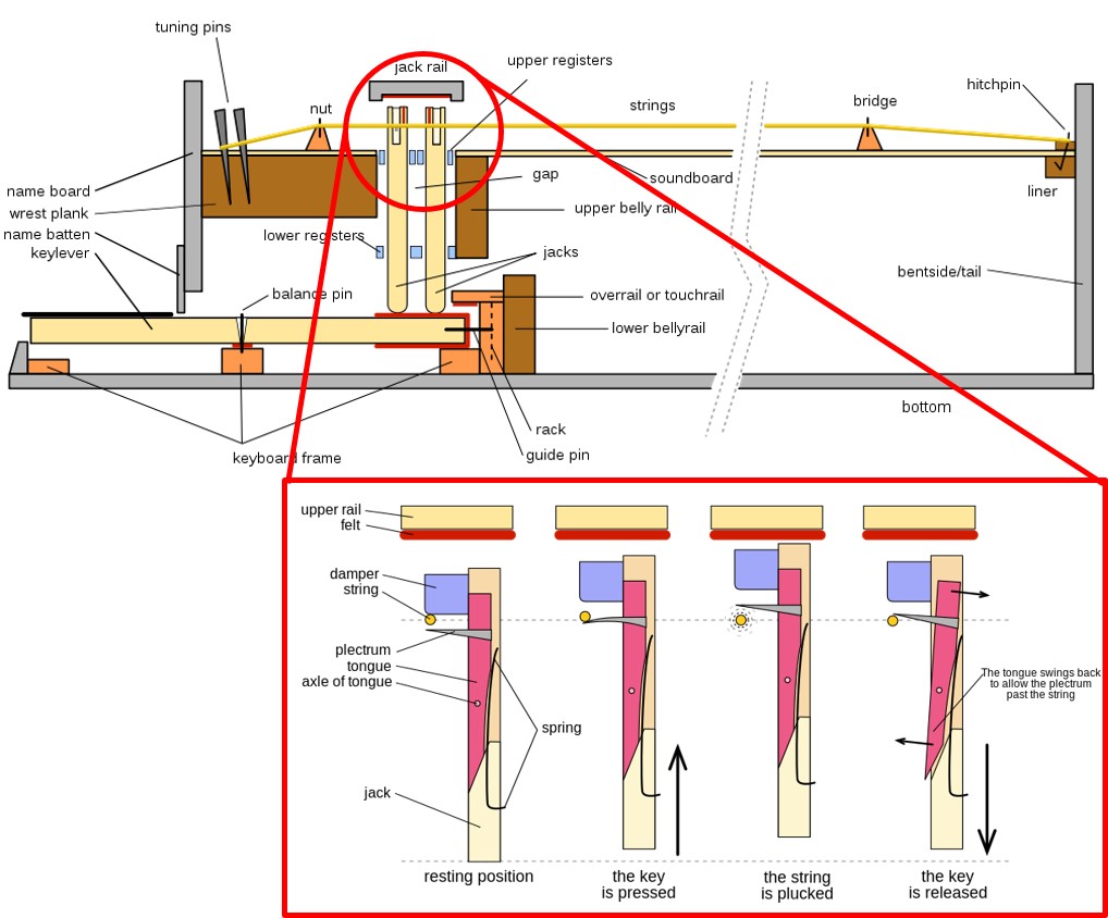 하프시코드의 건반은 피아노 건반과 흑백이 반대로 되어 있다. 수평하게 놓인 건반을 누르게 되면 지레의 원리에 따라 반대쪽에 있는 잭(jack)을 들어올리게 되는데 이 잭에 설치되어 있는 탄성력 있는 플렉트럼(plectrum)가 함께 올라가게 되면서 수평하게 놓인 현을 마치 기타줄 퉁기듯 뜯게 된다. 따라서 하프시코드 소리는 기타같이 현을 뜯는 소리이다. 이렇게 개량된 현명악기인 하프시코드의 소리는 집안에서 울려퍼지기에 적당한 수준이었는데다가 크기는 책상 정도에 불과했기 때문에 당시 돈 좀 있는 사람들이 집에 들여놓고 연습하기에 매우 좋은 악기였다.