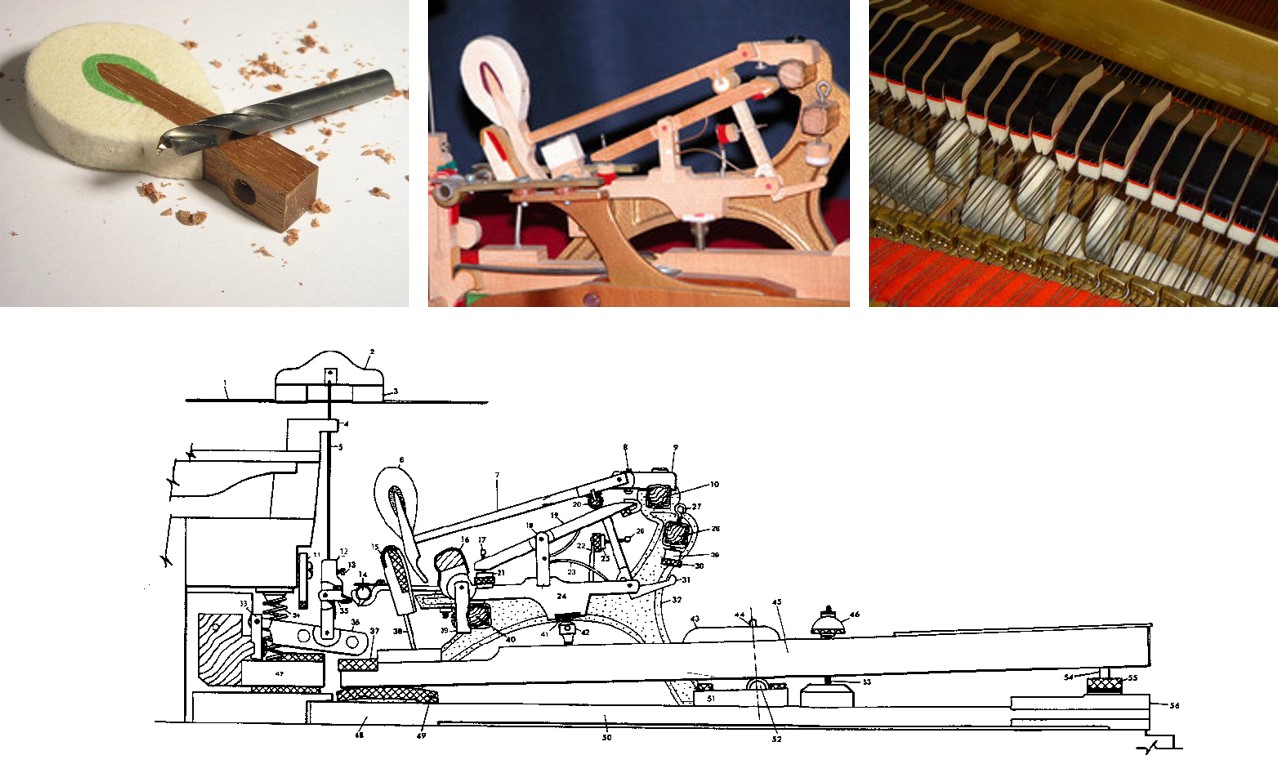 피아노의 발음 원리를 이해하는 것의 상당 부분은 바로 이 해머라는 특수한 구조를 이해하는 것에서 출발한다. 해머는 피아노의 건반마다 연결되어 있는 일종의 망치같은 구조인데 둥글게 마감된 해머의 주재료는 겹겹이 치밀하게 쌓은 부직포(不織布, nonwoven fabric)이다.4 건반을 눌렀을 때 부직포 해머가 연결된 정교한 목재 기계 구조들이 일사불란하게 움직이는데 이를 액션(action)이라고 부르며 아래의 영상을 보면 알겠지만 가히 복잡한 구조의 현란한 움직임이라 할 수 있다.