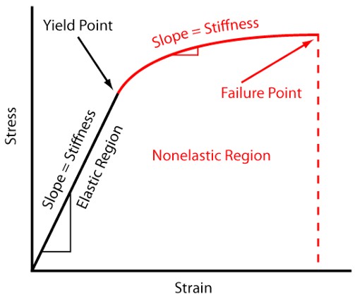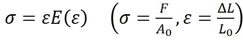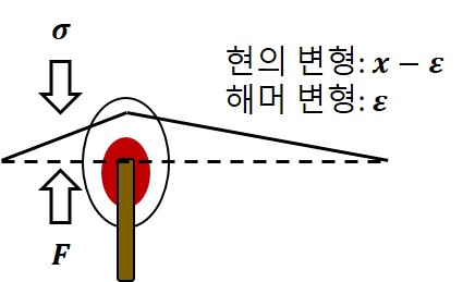 일차원적인 현의 변형과는 달리 해머의 변형은 3차원적이고 복잡하다.5 그런데 이러한 물질의 일반적인 변형을 불러일으키는 힘인 응력(σ, stress)과 변형(ε, strain) 사이에는 훅의 법칙과 비슷한 관계가 있으며 탄성 계수 k에 해당하는 영의 계수(E, Young's modulus)라는 것이 존재한다. 그런데 마치 용수철이 탄성체처럼 작용하다가 일정 수준 이상의 변형이 일어나면 더이상 탄성체처럼 작용하지 않게 되다가 결국 끊어지는 현상을 우리는 모두 초등학교 때부터 배워서 알고 있다. 이것은 용수철만의 특별한 성질이 아니고 변형을 겪는 세상 모든 재료들이 다 이런 성질을 갖는다. 즉, 일정 수준까지는6 응력에 비례하는 '선형적(linear)' 변형을 보이다가 그 이상의 응력에서는 비례하지 않는 '비선형적(nonlinear)' 변형을 보이게 된다. 이 경우에는 응력과 변형의 비인 영의 계수가 일정하지 않게 된다. 만일 어떤 물질이 선형적인 변형 구간을 상대적으로 많이 나타내어 영의 계수가 일정하다면 그것은 선형 탄성체라고 부를 수 있고, 대체로 비선형적인 변형 구간을 상대적으로 많이 보여 영의 계수가 일정하지 않게 된다면 그 재료는 비선형 탄성체라고 부를 수 있을 것이다.