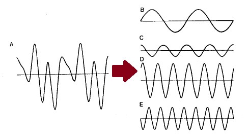 즉, 현에 발생하는 모든 정상파는 위의 그림과 같이 기본 정상파들의 선형 조합으로 구성되어 있으므로 곱하기와 더하기를 잘하면 주어진 정상파를 모두 분해하여 이 음이 어떤 배음들로 얼마만큼 구성되어 있는지 계산해낼 수 있을 것이다. 수학자들은 이런 과정을 곱셈과 덧셈을 이용해서 하지 않고 바로 푸리에 변환(Fourier transformation)이라는 기술을 사용하여 해낸다. 푸리에 변환은 시간 도메인의 어떤 함수를 진동수 도메인의 함수로 변환시키는 기법인데, 이를 이용하여 오실로스코프(oscilloscope)에 나타난 파형을 분석하여 어떠한 배음들이 조합되어 있는지 그 계수까지 다 밝혀내 준다.6