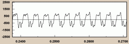 텔레비전 조정 시간에 등장할 것 같은 전자음으로 이 파동의 파형은 순수한 사인(sine) 곡선이다. 만약 피아노 건반을 눌렀을 때 기음의 파동만이 등장하고 다른 정상파들이 등장하지 않는다면 저런 소리가 들려야 한다. 정말 그렇게 생각하나? 애석하게도(?) 실제 피아노 음의 파형은 다음과 같다.