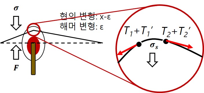 해머가 현을 위로 강하게 때려 올리면 현에 위쪽으로 변형(x-ε)이 생기고, 해머에도 변형(ε)이 생긴다는 것을 전편에서 언급했었다. 그런데 물리학에서 현은 대체로 미소한 단위의 점 성분들이 장력(tension)에 의해 서로 1차원적으로 연결되어 있는 것으로 인식된다. 따라서 아래 그림에서와 같이 변형된 현을 확대해서 살펴본다면, 변형된 부분의 점 성분들은 모두 휘어진 현의 접선의 방향으로 장력을 받게된다고 기술할 수 있다.