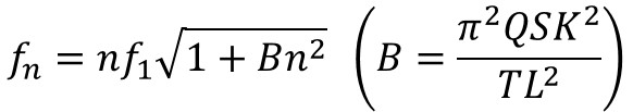 그런데 위의 두 이야기는 같은 얘기다. 앞 장의 논의에서 우리는 이미 장력(T)이 커지면 속도(v)가 커지는 것을 알고 있지 않은가? 결국 두 이야기는 같은 현상의 다른 접근일 뿐 같은 결론을 제시하는데. 바로 배음 차수가 높아질수록 정상파에 걸리는 장력이 커진다 = 정상파의 속도가 빨라진다는 것이다. 그런데 장력이 커지면 정상파의 진동수가 높아지지 않는가? 따라서 우리는 배음 차수가 높아질수록 기존에 예상되었던 기음 진동수의 정수배 값에서 벗어난, 예상치보다 더 커진 값을 갖게 된다는 결론에 이른다.