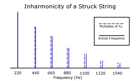 따라서 이 배음들은 더 이상 엄밀한 의미에서는 조화 배음(harmonic overtone)이 아니다. 왜냐하면 진동수 값들이 정확하게 기음 진동수의 정수배가 아니기 때문이다. 이처럼 완벽한 정수배에서 약간 벗어난 진동수를 가지는 파동들을 일컬어 불협화성(inharmonicity)을 갖는다고 하며7 이러한 부조화성을 가진 이들을 부분 배음(partial)이라고 부른다.