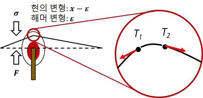해머가 현을 때릴 때 우리는 현이 x만큼 변형된다고 말해 왔었다. 이 변형은 결국 휘어짐(bending)이며 x는 결국 휘어짐에 의한 변위(displacement)가 될텐데, 이를 좀 더 구체적으로 계산하면 다음과 같이 표현할 수 있다.