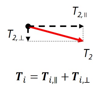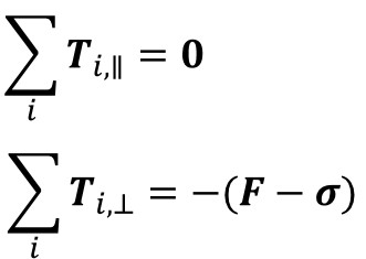 변형된 현에 작용하는 장력들을 모두 더하면 어떻게 될까? 힘은 벡터(vector)이므로 벡터합을 잘 생각해보자. 현이 수평하게 놓여있다는 가정하에서 계산할 때, 우선 장력을 수평방향 장력(T∥)과 수직방향 장력(T⊥)으로 나눠서 생각할 수 있다. 그렇다면 장력의 합은 수평방향 장력들의 합과 수직방향 장력들의 합과 같을 것인데, 다행히도(?) 수평방향 장력의 합은 0이 된다. 그러니 수직방향으로 현을 퉁길 때 현이 왼쪽이나 오른쪽으로 움직이지 않는 것이다. 수직방향 장력들의 힘을 다 합치면 (이상적으로는) -(F-σ)가 된다. 즉, 해머가 현을 변형시킬 때 밀어붙인 힘과 크기는 같으나 반대는 방향인 장력이 변형된 현에 형성되어 해머를 아래 방향으로 짓누르는 것이다. 이것은 뉴턴의 제3법칙인 작용-반작용의 법칙을 이해하면 너무나 쉽게 이해할 수 있는 부분이다.