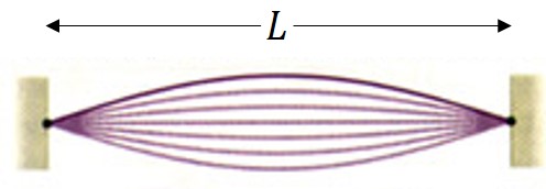 이론적으로는 이와 같이 무수한 개수의 정상파가 형성된다. 처음에 보여주었던 기본 정상파를 기음(fundamental) 혹은 1차 배음(first harmonic)라고 부르는데 이 정상파의 파장은 2L이 된다. 그 아래 정상파를 보자. 우리는 이것을 2차 배음(second harmonic)이라고 부를 수 있는데, 이 정상파의 파장은 L이 된다. 그 아래는? 3차 배음(third harmonic)의 파장은 2/3 L이다. 이와 같이 일반화를 하면 n차 배음의 파장은 2L/n이라고 쓸 수 있다. 즉, 정상파의 배음 차수가 늘어날수록 파장은 2배, 3배, 4배... 작아진다. 그런데 이 정상파들은 모두 같은 매질에서 같은 힘을 받아 같은 속도로 움직이는 파동들이다. 파동의 속도는 진동수와 파장의 곱으로 나타낼 수 있으므로 (v=fλ), v가 같은 값을 유지하려면 배음 차수가 늘어날수록 진동수는 오히려 2배, 3배, 4배... 커져야 한다.