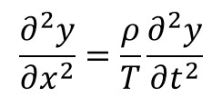 한편 속도 v로 진행하는 파동은 일반적으로 y(x,t) = A sin[2πf(x-vt)] 와 같은 사인함수로 표현할 수 있으므로 이 식을 위 미분 방정식에 대입하면 다음과 같은 결론을 얻을 수 있다.