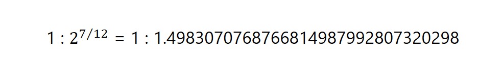 물론 기원전의 피타고라스 및 그의 학파 사람들이 살아 돌아온다면 이 평균율을 무척 저주했을 것이다. 그들의 수 체계에 포함되지 않는 더러운(?) 무리수가 조화로운 음률을 더럽혔으니(?) 말이다. 예를 들어 완전5도를 살펴보자. 피타고라스 음률 및 순정률에서 완전5도의 진동수 비율은 2:3이었다. 그러나 평균율에서는...