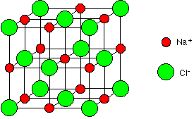 소금의 경우에는 조금 다르다. 화학을 모르는 사람들도 소금이 NaCl이라는 것은 너무나도 잘 아는데, 소금은 소듐 이온(Na+)과 염화 이온(Cl-)이 교대로 나열되어 있는 형태를 가진다. 이들 이온은 전하를 띤 입자들이므로 이온 사이에는 쿨롱의 법칙(Coulomb's law)을 따르는 정전기적 인력(electrostatic force)이 작용하며, 이 힘 때문에 이온들은 서로 떨어진 채로 개별적으로 존재하는 것이 아니라 서로가 서로에게 붙잡혀 구속된 채 일정한 거리를 두며 배열되어 있으며 그 결과 거대한 NaCl 결정을 이루게 된다.
