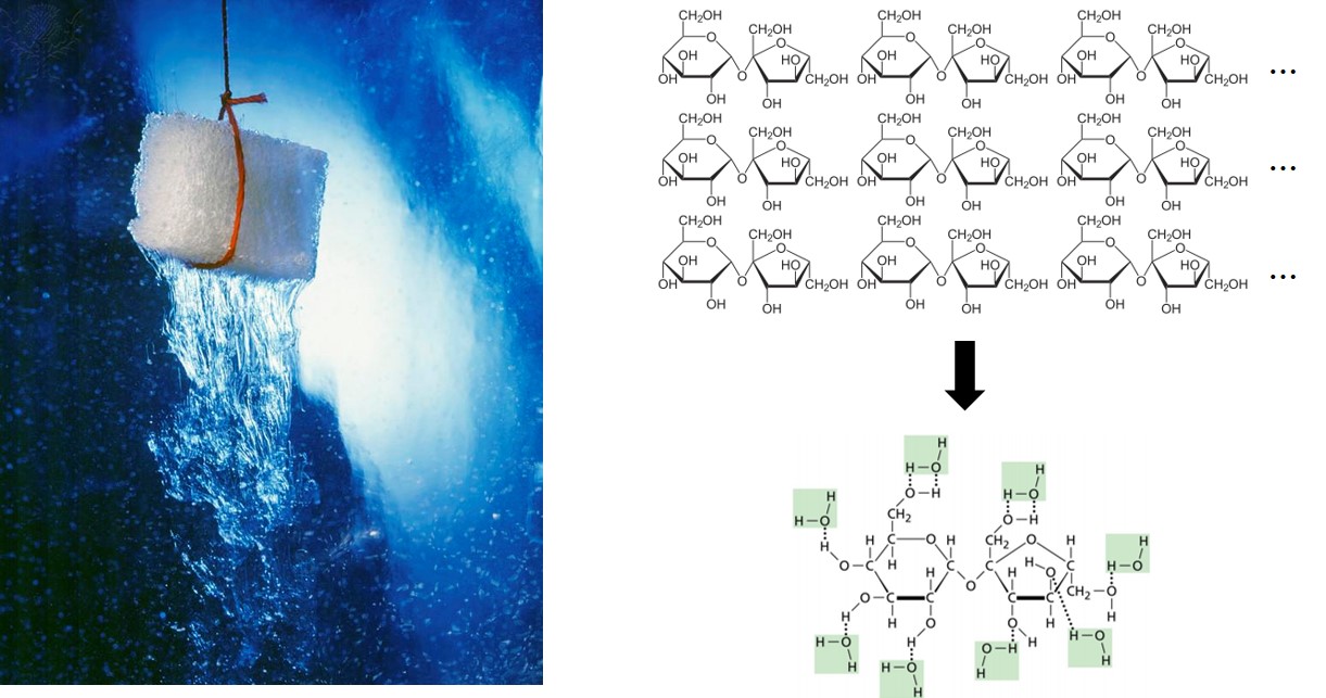 예를 들어 각설탕은 설탕 분자들의 거대한 집합인데 설탕 분자를 좀 더 유식한 말로 수크로스(sucrose) 혹은 자당(蔗糖)이라고 부른다. 수크로스 분자는 글루코스(glucose)와 프럭토스(fructose)가 글리코사이드 결합(glycosidic bond)2으로 결합되어 있으며 약간 극성(polar)을 띠는 물질이다. 따라서 수크로스 분자들은 자체적인 극성으로 인해 쌍극자(dipole)를 형성하는데, 이렇게 형성된 전기 쌍극자 사이에서는 서로 인력이 작용한다.3 이런 이유로 수크로스 분자들은 자기들끼리 있을 때 분자들 낱개로 산산조각 흩어져서 존재하지 않으며 전기 쌍극자 모멘트 사이의 힘에 의해 결합되어 거대한 덩어리를 이룬다.