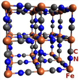 프러시안 블루가 철의 사이안화물이라는 사실은 100여년이 지난 1811년 프랑스의 화학자 조제프 게이뤼삭(Joseph Gay-Lussac)이 프러시안 블루를 가열함으로써 얻은 사이안화수소(HCN)를 분석한 논문을 통해 확인되었다.10 하지만, 프러시안 블루가 정확히 어떤 구조로 철의 사이안화물을 구성하고 있는지 이해하기 위해서는 또다른 100여년의 세월을 필요료 했다. 정확히는 무기화합물의 결합 방식의 이해에 더해 X선을 이용한 회절(diffraction)분석법이 요구되었는데, 1936년에 최초로 이를 통한 분석이 시도된 이후,11 최종적으로 프러시안 블루의 구조가 확정된 것은 최초로 합성된지 무려 270여년이 지난 1977년에야 가능하게 되었다.12 확인된 바에 따르면 프러시안 블루의 화학식은 Fe4[Fe(CN)6]3·xH2O으로 표현 가능하며, 사이아노(-C≡N:) 리간드가 철 원자 사이를 다리 놓듯 배위결합하고 있는 것을 기본으로 한 구조이다.